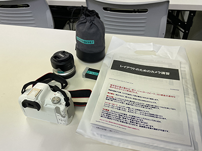 EOS学園さんからお借りしたカメラと、橋本先生に執筆して頂いたテキストです。このカメラを実際に操作してカメラの扱い方を、テキストでカメラの原理を学んでもらいます。